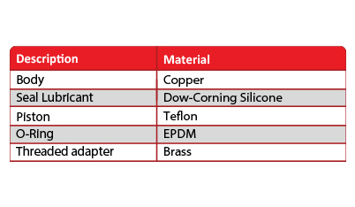 Pre- charged hard drawn copper surge pressure absorber with teflon piston, EPDM O-ring seals, and male NPT or BSPT connection.